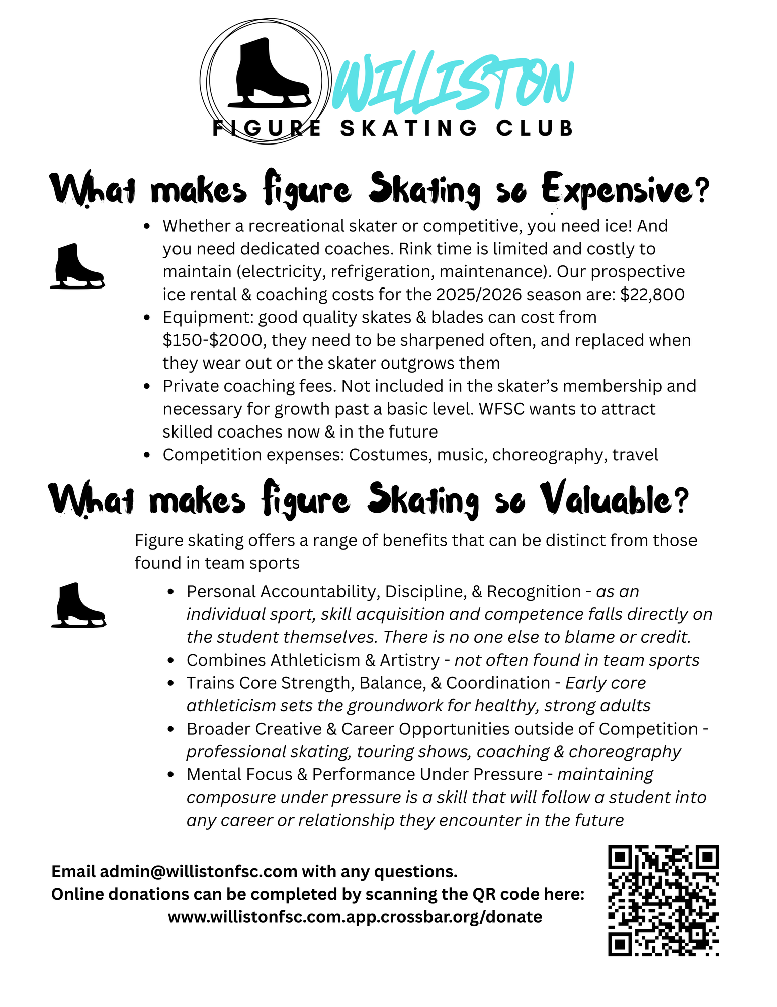 Thank you for your interest in Williston Figure Skating Club! We are always accepting donations to help offset the cost of ice, keep fees lower for members, host an ice show, and potentially build up skater support programs like "sponsor a skater" or a skate lending library, etc. We believe figure skating should be accessible to everyone.