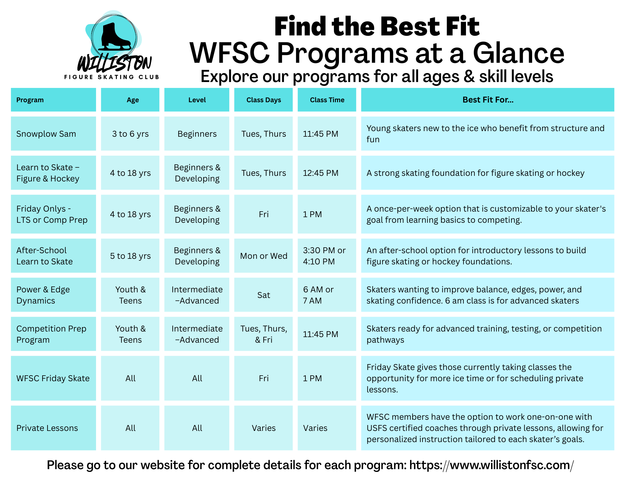 Please note that ice skating, and associated activities for building skills, are inherently dangerous. Williston Figure Skating Club (WFSC) releases all liability for any injuries or accidents that occur during events hosted by WFSC.