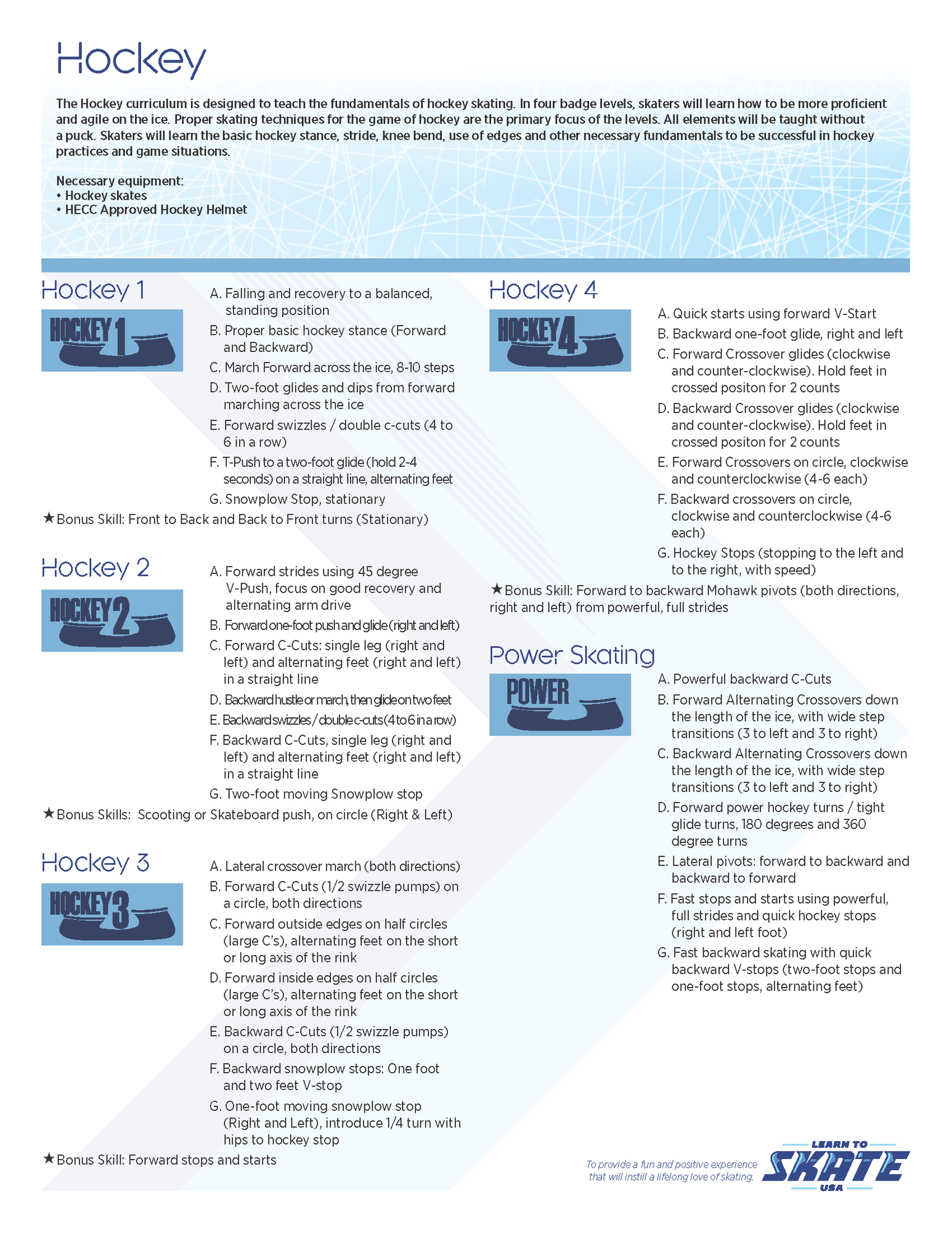 We offer testing for Hockey badges through Learn to Skate USA, just like we offer testing for their Figure Skating badges. Our classes will be combined until we grow too big to do so, but each skater will test according to their preferred discipline.